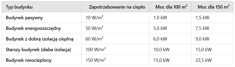 Poniżej przedstawiam przykładową tabelę, która pokazuje, jakie moce grzewcze będą wymagane dla różnych typów budynków – obliczone dla przykładowych powierzchni 100 m² i 150 m²: